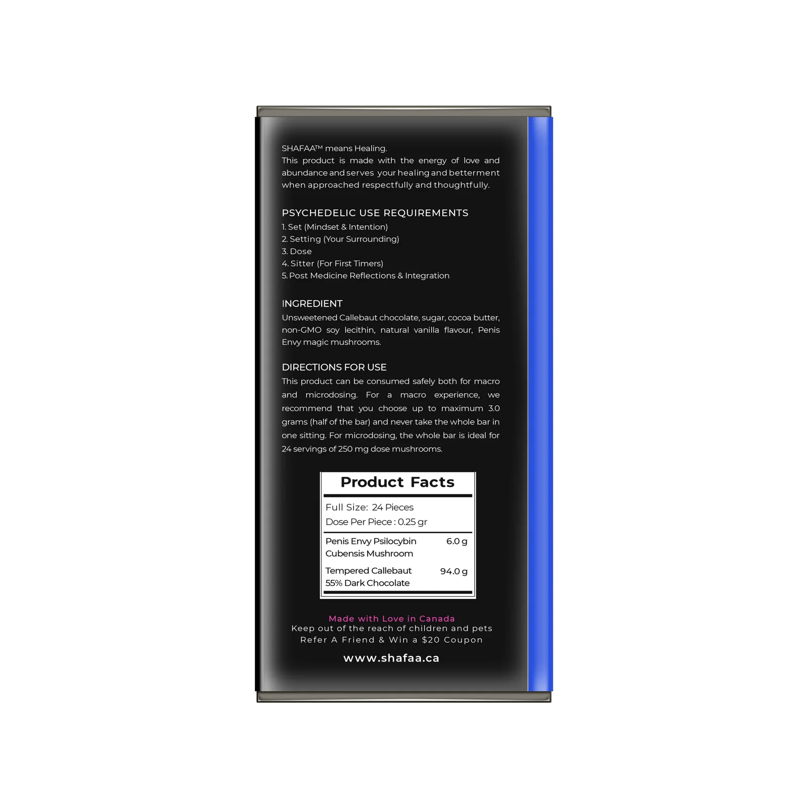 Shafaa Penis Envy 6 gram Magic Mushrooms Dark Chocolate Bar Edibles is developed for the chocolate connoisseur! By collaborating with expert chocolatiers SHAFAA has developed a premium quality, vegan dark chocolate bar. This tempered Callebaut chocolate is formulated to avoid the powdered texture and taste of mushrooms while maximizing the potency of the Penis Envy strain.